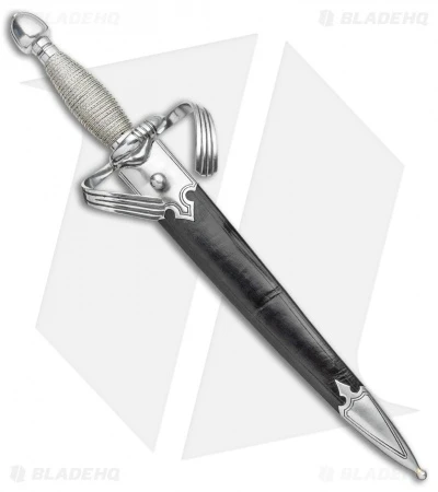 The Cold Steel Large Parrying Dagger has a 13-inch double-edged blade with and up- and out-swept cross guard for catching blades. Includes a leather sheath-wrapped wooden handle.